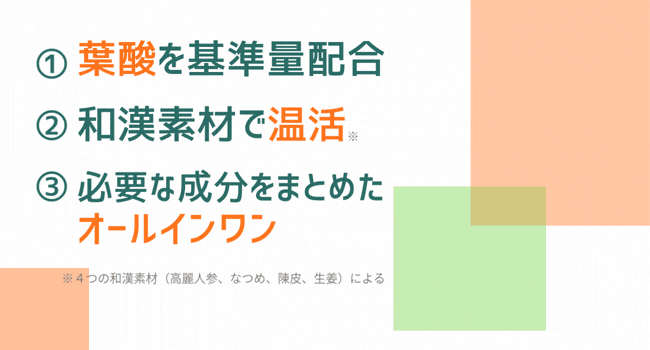 ※葉酸と温活効果が期待できる和漢素材を組み合わせて配合している葉酸サプリは2019年4月発売時点で当社が史上初(自社調べ)